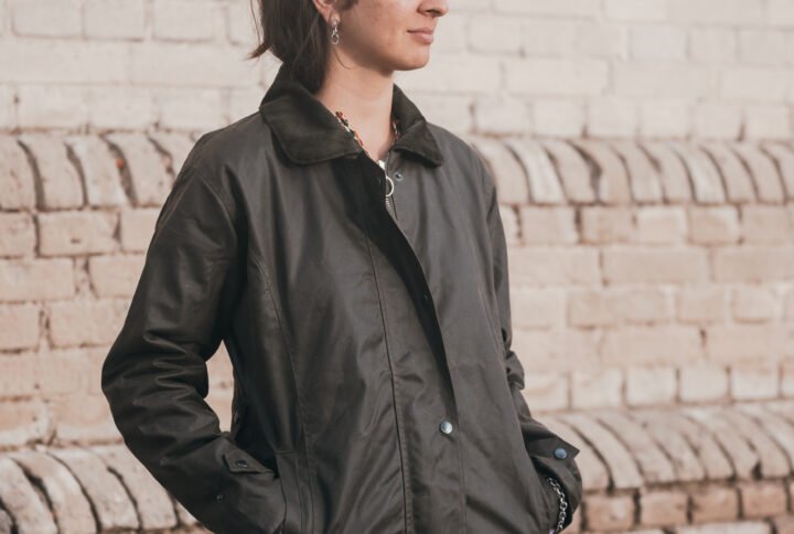 El forro interior es 100 % algodón encerado a cuadros con forro de tartán, con puños ajustables con tachuelas para un ajuste y protección adicionales. La chaqueta exterior está hecha de 100 % algodón encerado de gran peso, lo que la hace resistente a la lluvia.